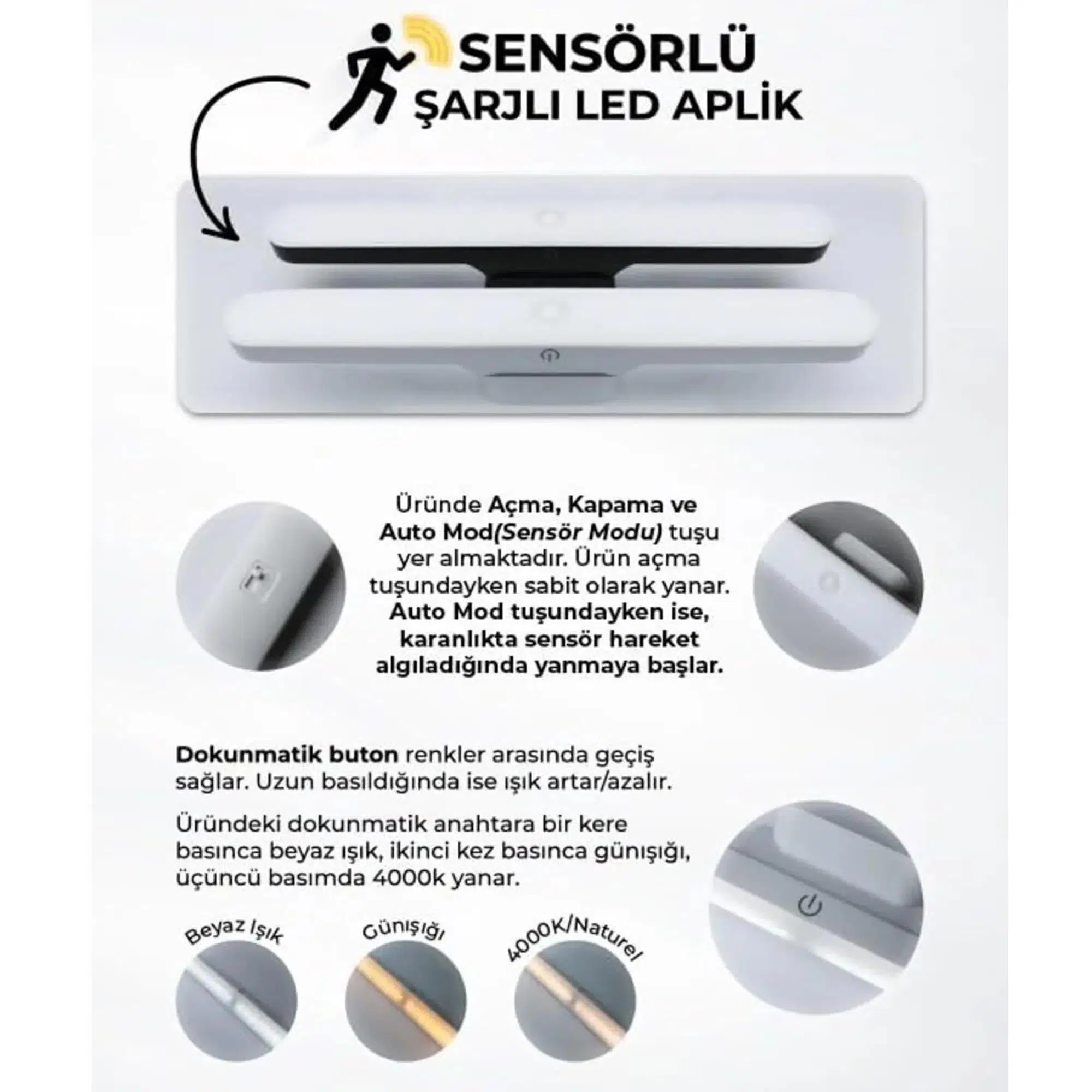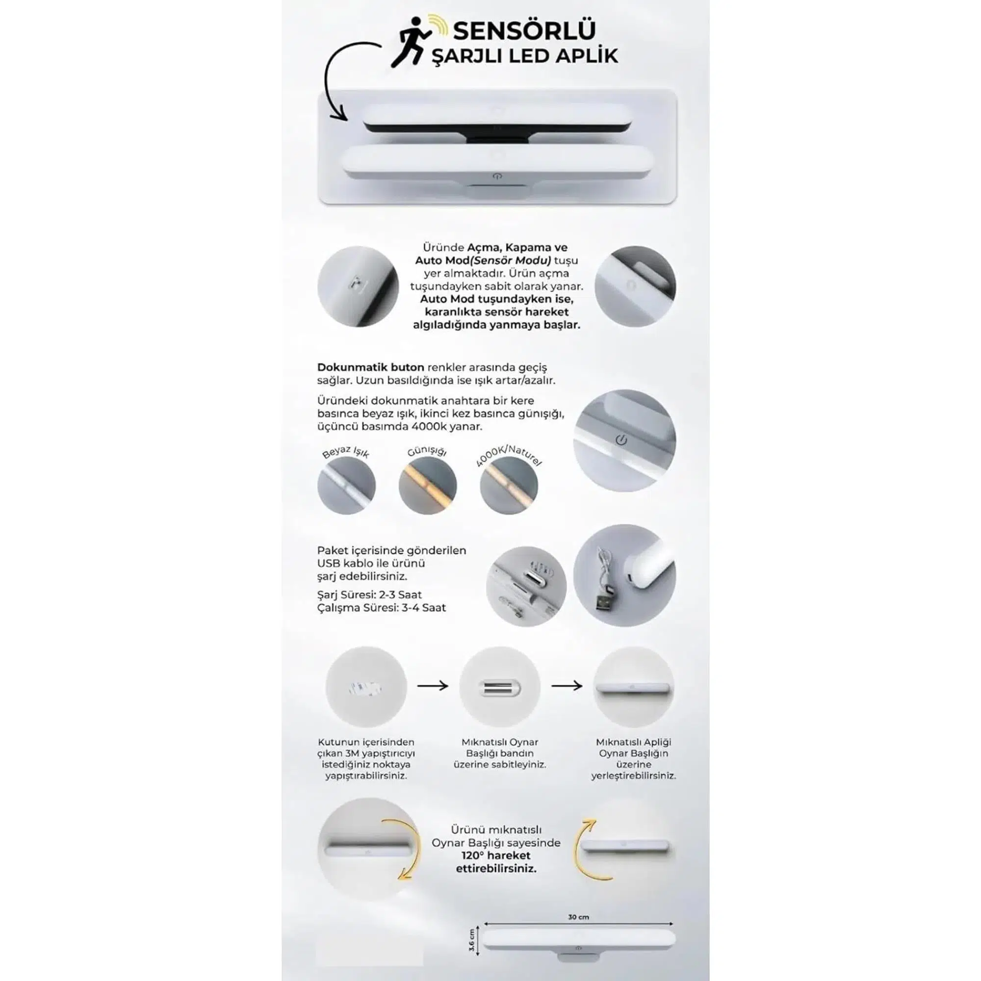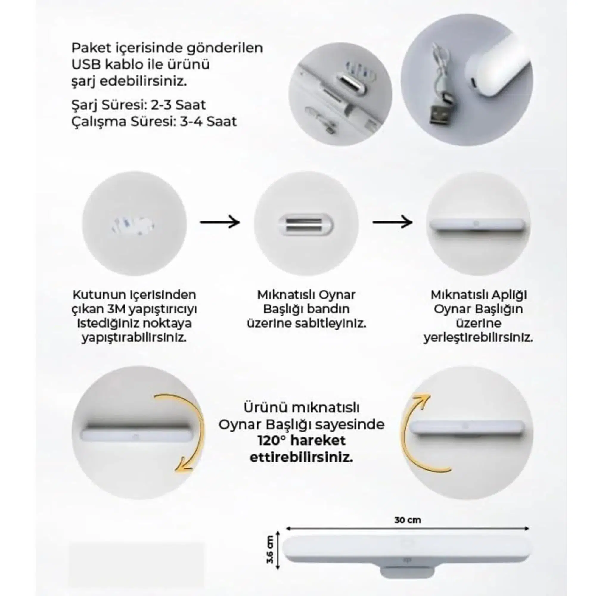 5. Pil tam şarj için sadece 3 saat sürer ve yumuşak modda 48 saat, orta modda 10 saat ve parlak modda 3 saat sürebilir. Dolap, garaj, yatak odası ve koridor için.