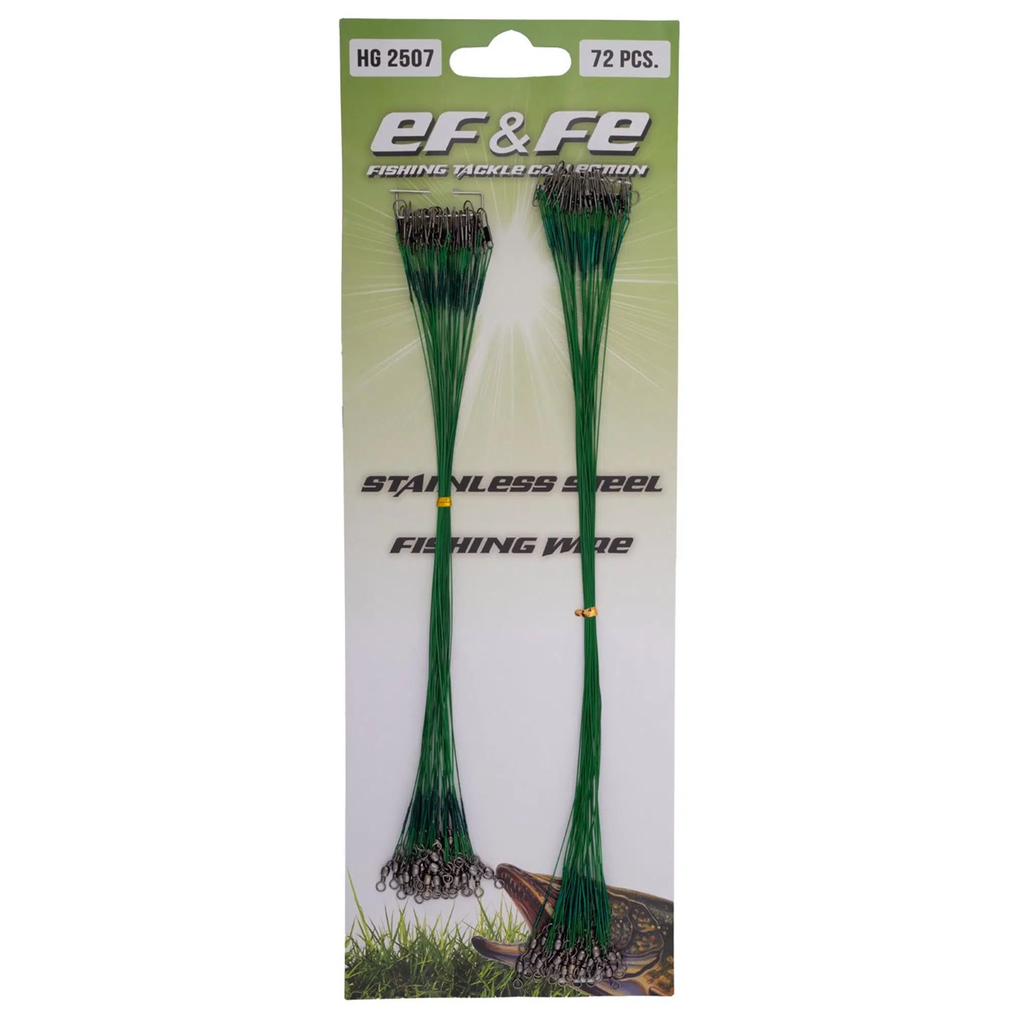 Effe HG2507, özellikle turna ve lüfer gibi dişli/yırtıcı balıkların avı için tasarlanmış, yüksek mukavemetli bir çelik tel lider setidir. Yeşil renkli kaplaması sayesinde su altındaki kamuflaj sağlar ve paslanmaya karşı ekstra direnç gösterir.