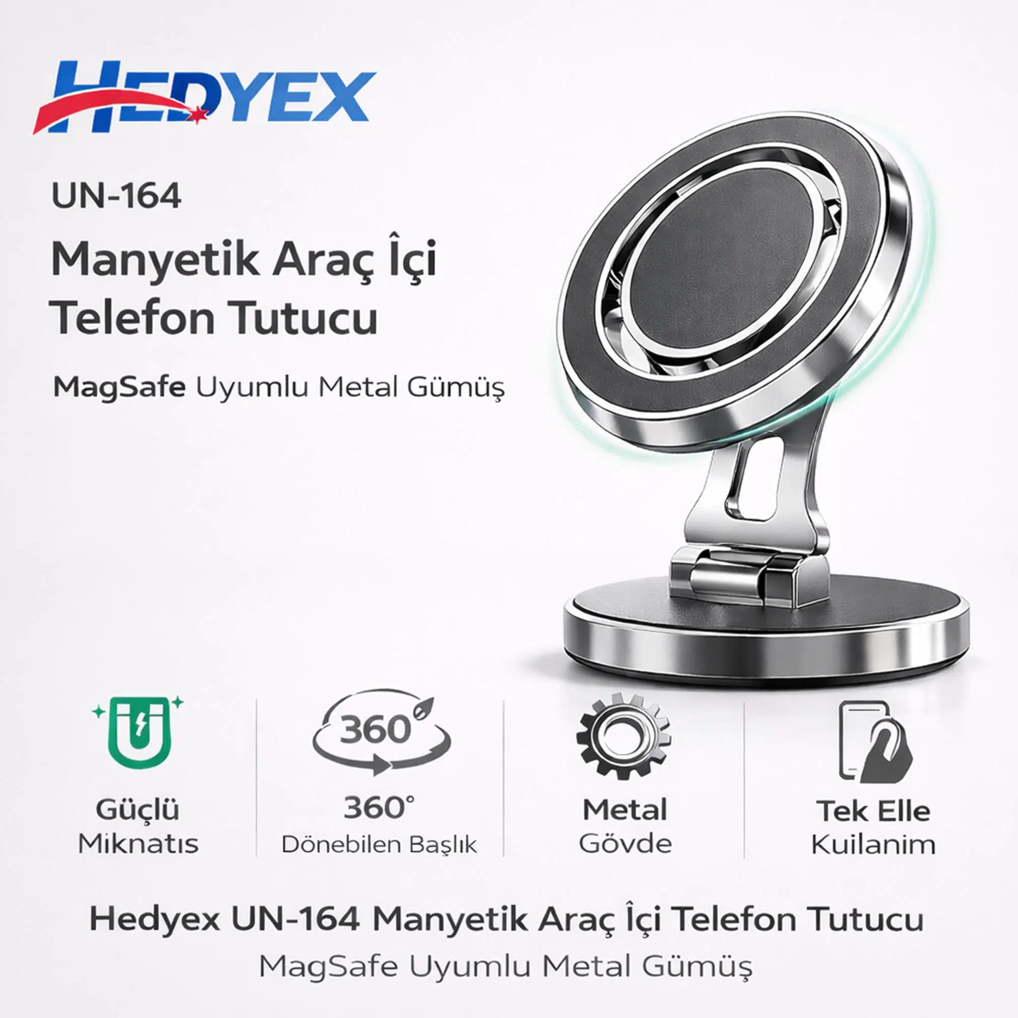 Hedyex UN-164, MagSafe teknolojisiyle tam uyumlu, dayanıklı metal gövdeye sahip, premium bir araç içi telefon tutucudur. Güçlü mıknatıs yapısı ve estetik gümüş tasarımı ile sürüş esnasında cihazınızı güvenle sabitler.
