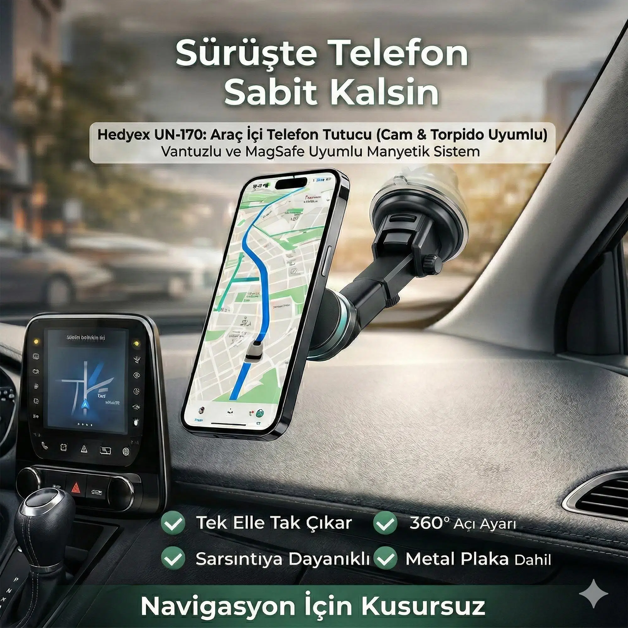 Hedyex UN-170, MagSafe uyumlu manyetik sistemi ve güçlü vantuz mekanizmasıyla hem cam hem de torpido üzerinde üstün tutuş sağlar. Navigasyon kullanımı ve güvenli sürüş için tasarlanan bu tutucu, sarsıntılara karşı dayanıklı yapısıyla telefonunuzu her koşulda sabit tutar.