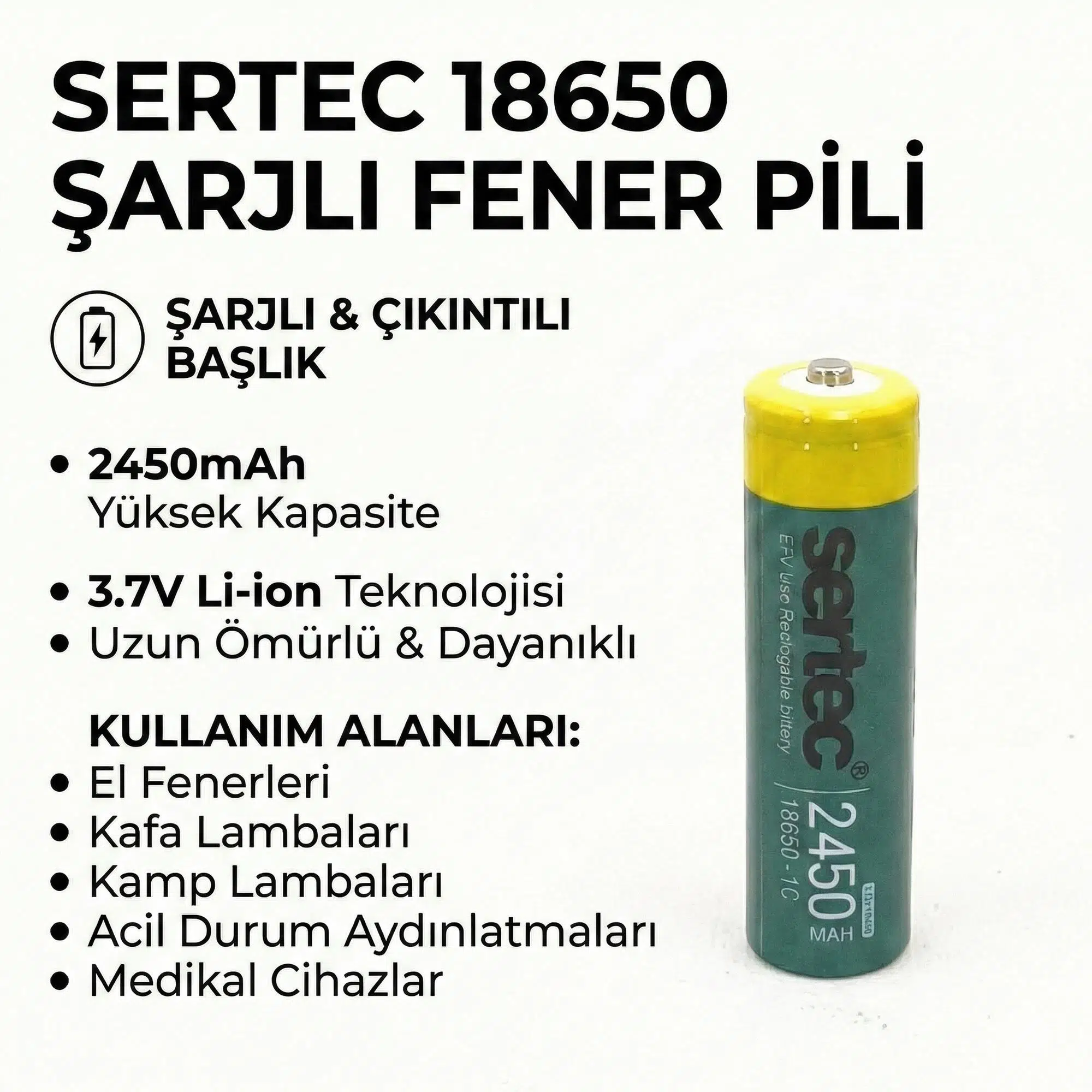 Sertec 18650 1C Şarjlı Pil 2450mAh Çıkıntılı Başlıklı Fener Pili 3.7V Li-ion