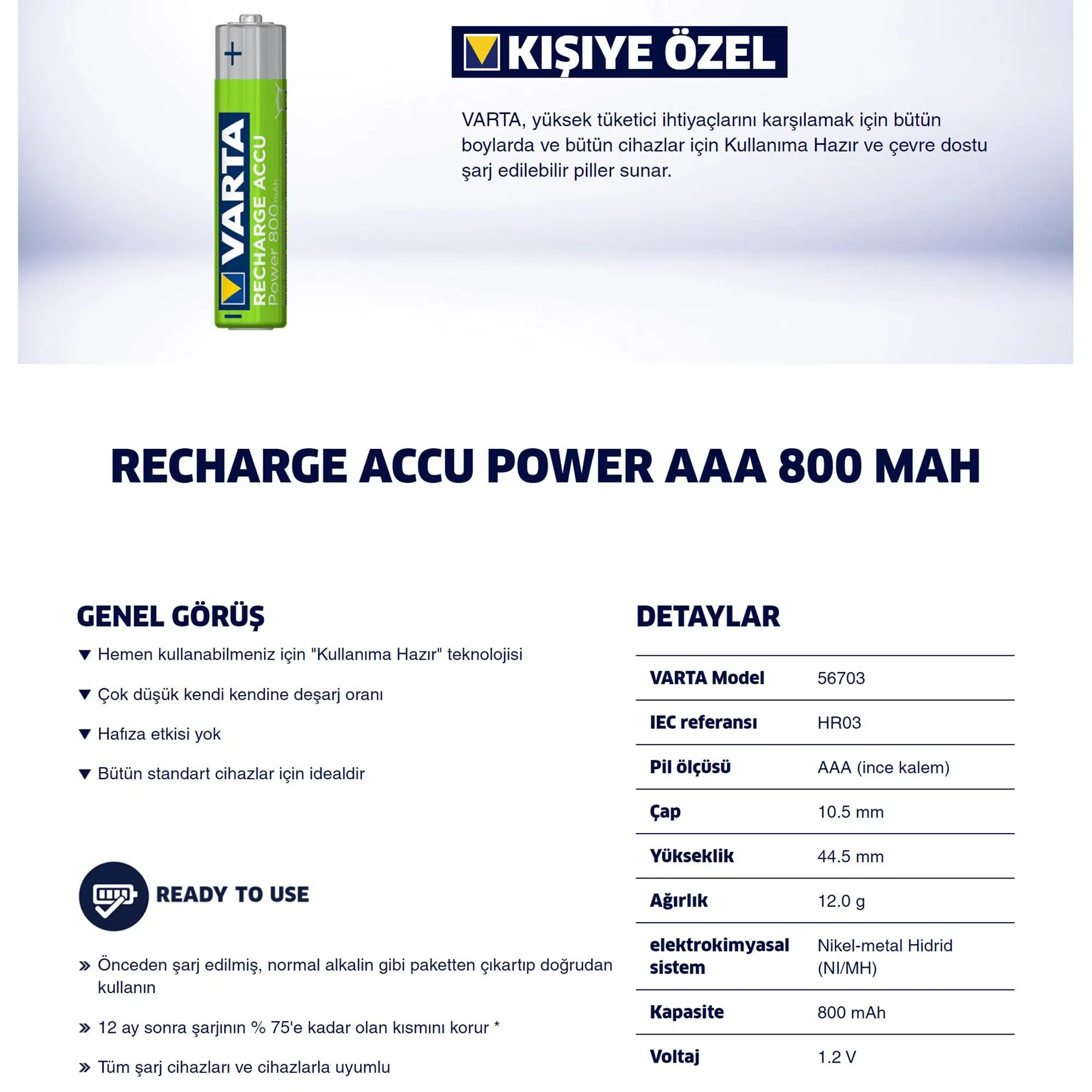 Varta 800mAh AAA Şarj Edilebilir İnce Kalem Pil 2Li Şarjlı Pil